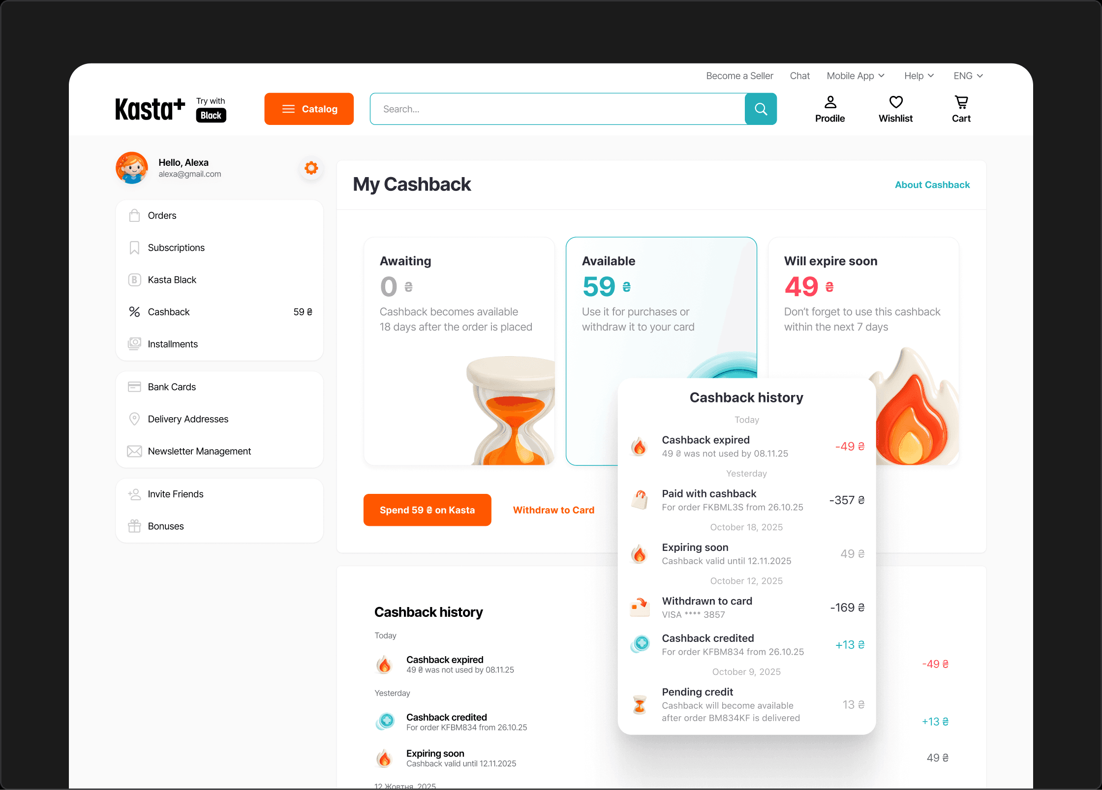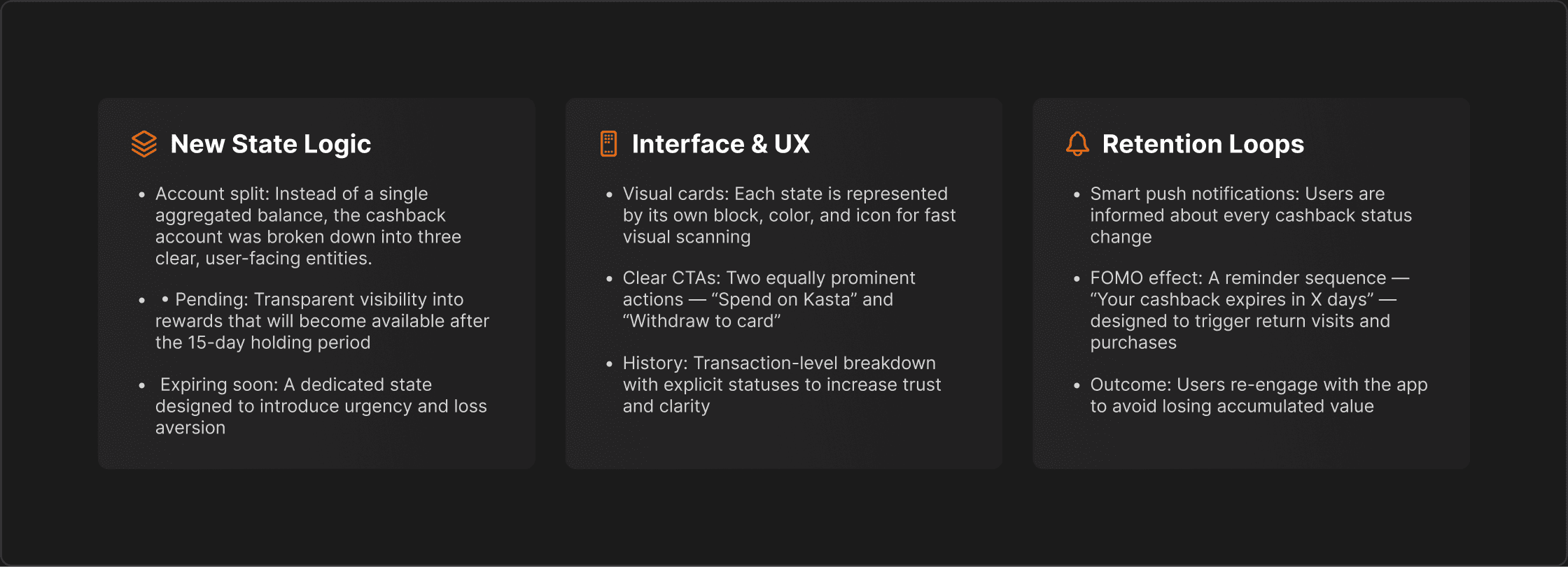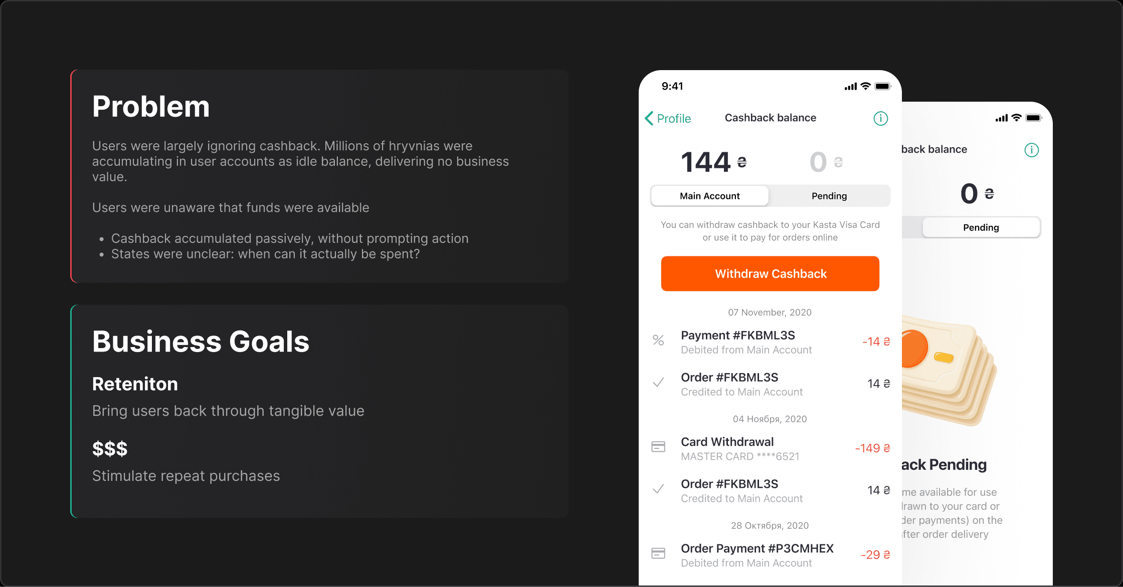At Kasta, users were largely ignoring their accumulated cashback, leaving millions of hryvnias idle in accounts. Cashback entered a “pending” state immediately after payment and only became spendable 15–18 days after delivery. Users were unaware of available funds, unsure when they could use them, and the program wasn’t driving repeat purchases.