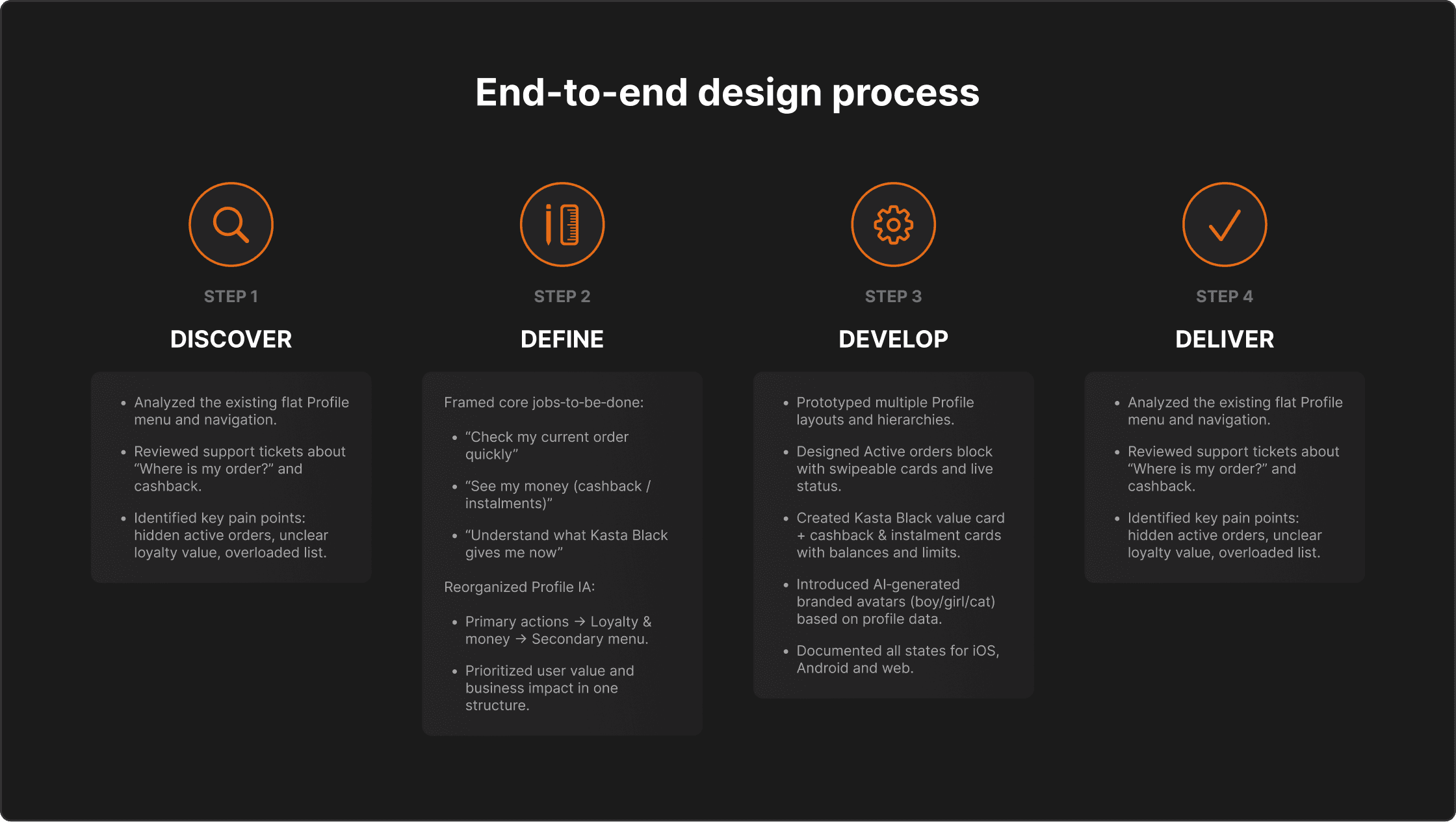 Define: mapped key JTBD — “check my order quickly”, “come back to saved items”, “see how much money I have in cashback/instalments”, “understand what Kasta Black gives me right now” — and built a new content hierarchy around them.