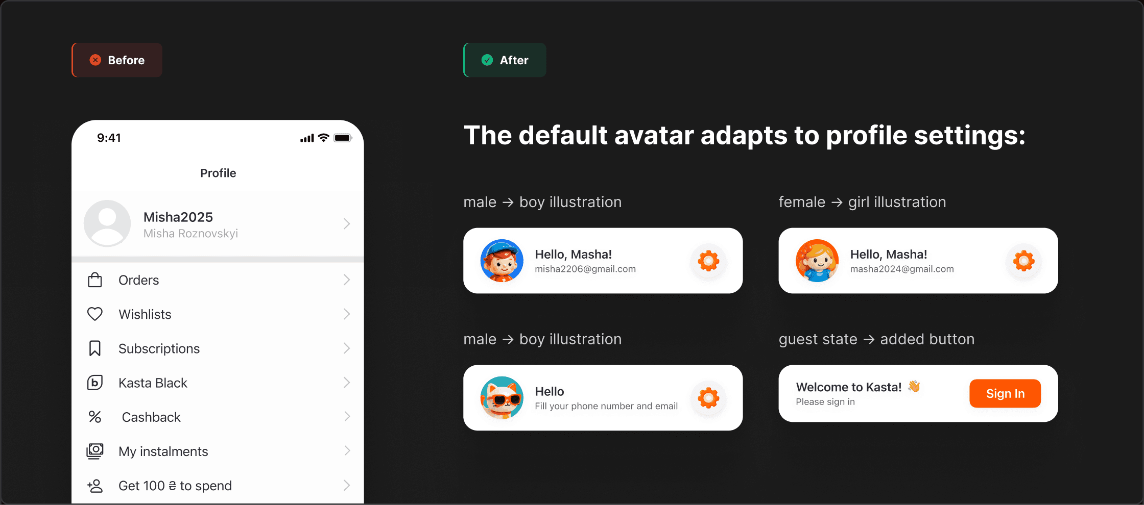 This small change made the Profile feel more friendly and personalised, and brought more of the Kasta brand into the everyday experience.