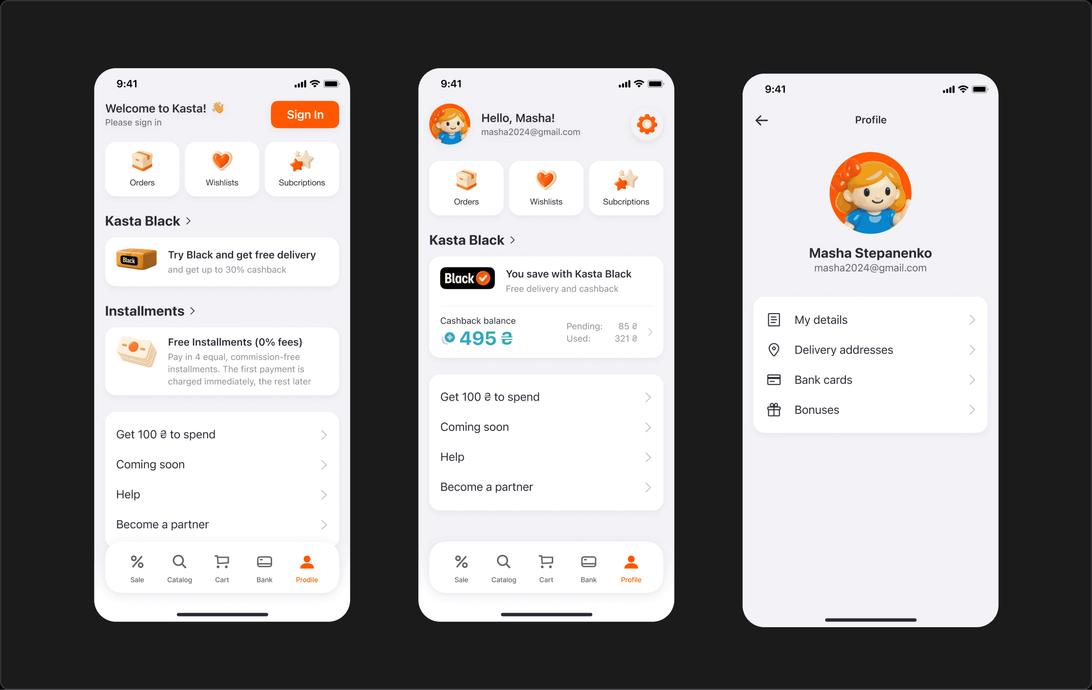Kasta is a Ukrainian e‑commerce marketplace with a paid loyalty program, Kasta Black. As the Lead Designer, I redesigned the Profile experience on iOS, Android and web, turning a flat list of menu items into a personal hub for orders, favourites, cashback and instalments — and making the value of Kasta Black visible by default.