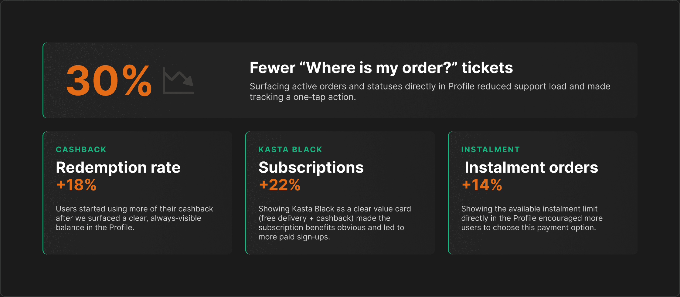 Support tickets about order status decreased by 30%, because active orders and their latest statuses became visible directly in the Profile.