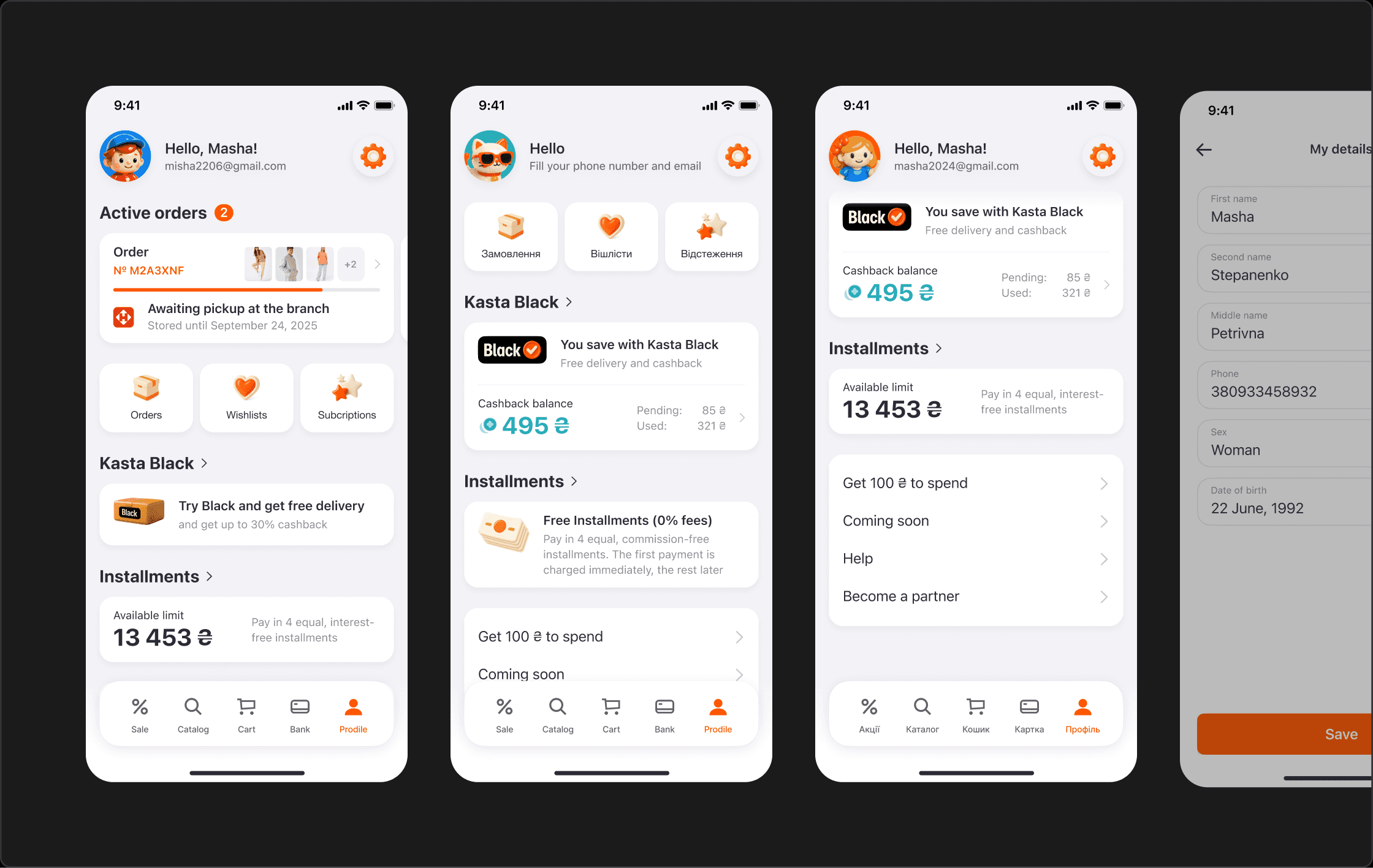 Develop: prototyped several Profile layouts, explored different positions for orders, loyalty and money blocks, and worked through edge cases (no orders, multiple orders, no Black, zero cashback, maxed‑out instalment limit).