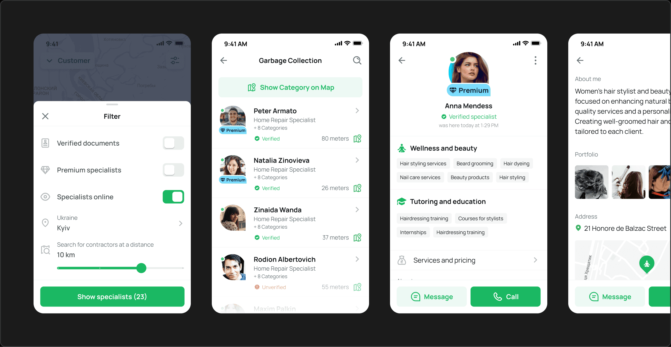 Clients see photos of work, ratings, categories, prices and exact location or district on each profile, building trust before messaging.